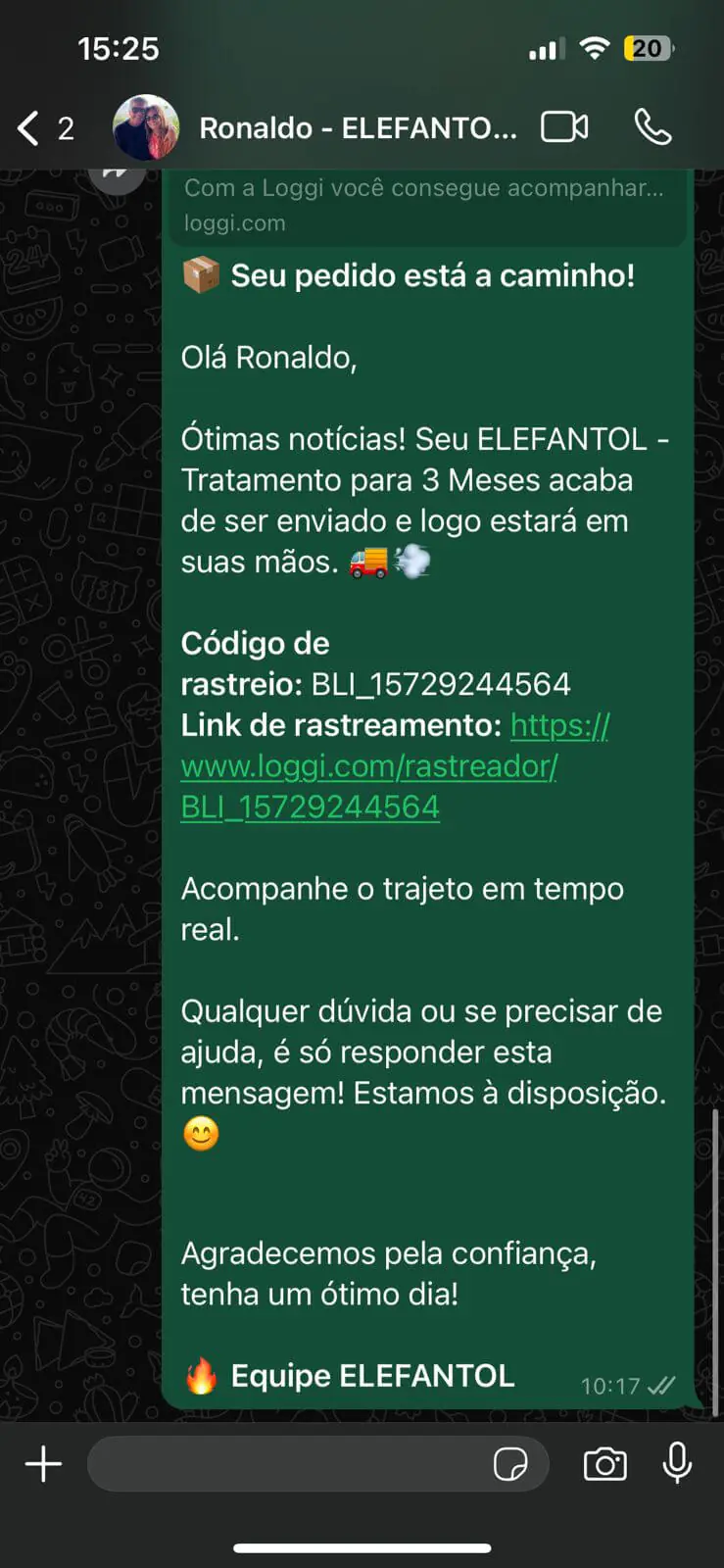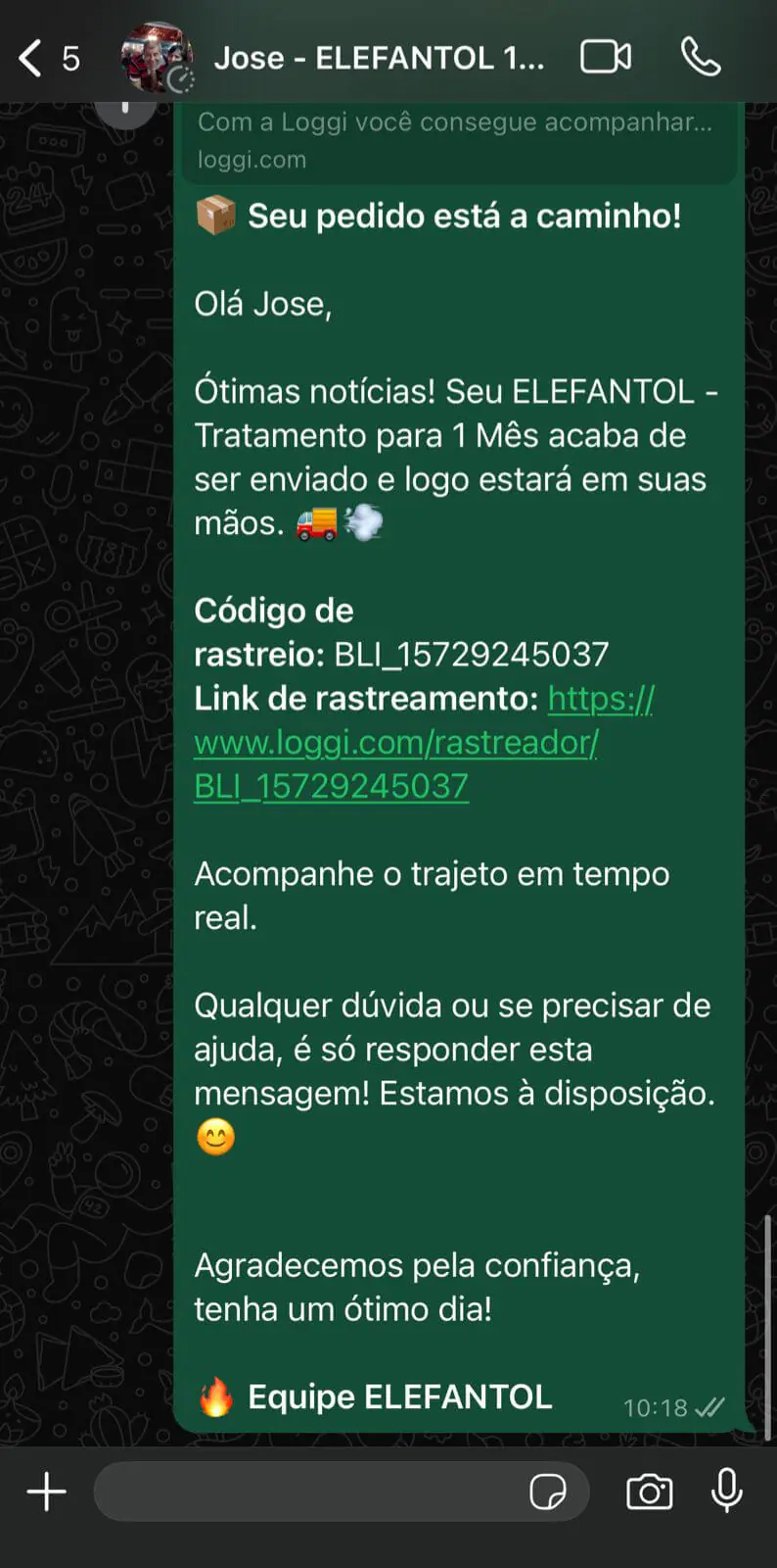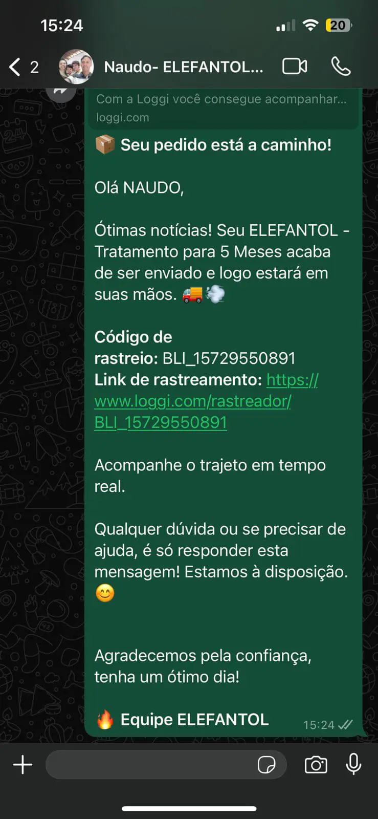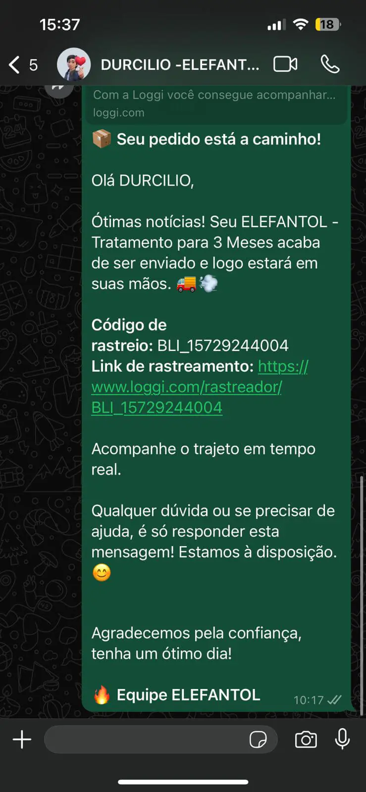 O prazo médio de entrega do Elefantol é de 5 dias úteis para o Sul e Sudeste. Para as demais regiões do país, o prazo de entrega é de 7 dias úteis, normalmente entregue antes. O prazo começa após a confirmação do seu pagamento pela administradora do seu cartão de crédito ou após a confirmação do pagamento do boleto.